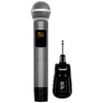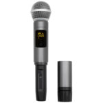 Bežični set, profesionalni mikrofon i prijemnik, višenamjenski digitalni zaslon na ručki, prikaz frekvencije / kanal / stanje baterije, digitalni filter šuma, automatsko uparivanje, 20 kanala koji se mogu odabrati za prijem bez smetnji, Ø6,3 mm priključak za mikrofon na prijemniku, punjivi prijemnik se može izravno priključiti na pojačalo, domet na otvorenom prostoru do 40 m, frekvencijski opseg 550-565,2 MHz, dimenzije mikrofona Ø50 / 33 x 240 mm, napajanje mikrofona 2 x AA (1,5 V) baterije, nisu uključene u pakiranje, diemezije prijemnika Ø80 x 42 x 17 mm, napajanje prijemnika ugrađena Li-Ion baterija 500 mAh, vrijeme punjenja / vrijeme rada cca 2,5 / 6 h, pribor kabel za punjenje USB – microUSB (1.0 m)